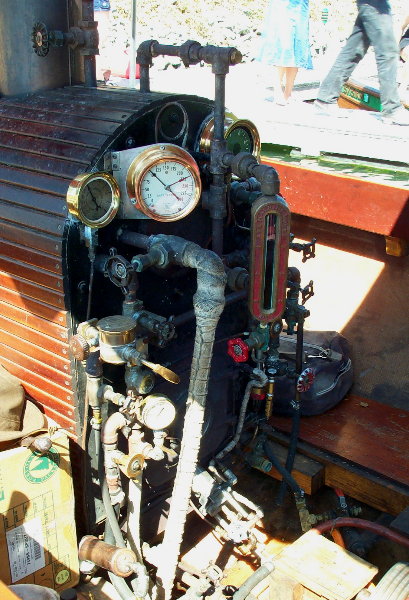 The watertube boiler can be fired with wood, diesel, or both, a wood fire serving to instantly relight the diesel if need be. The gauge in the center is the pressure gauge with an indicator set at the safety valve pressure (225psi).