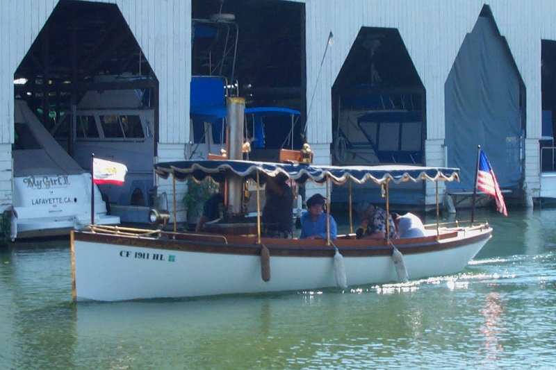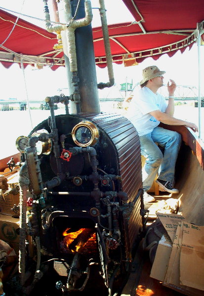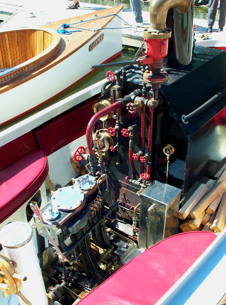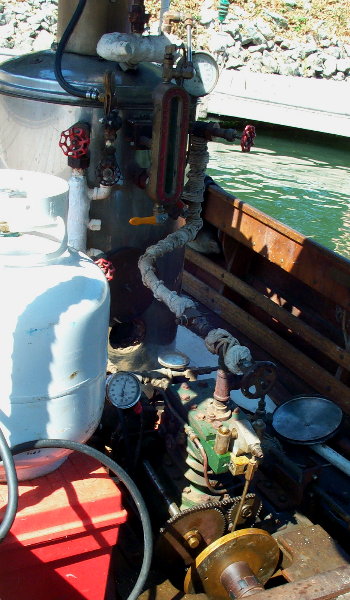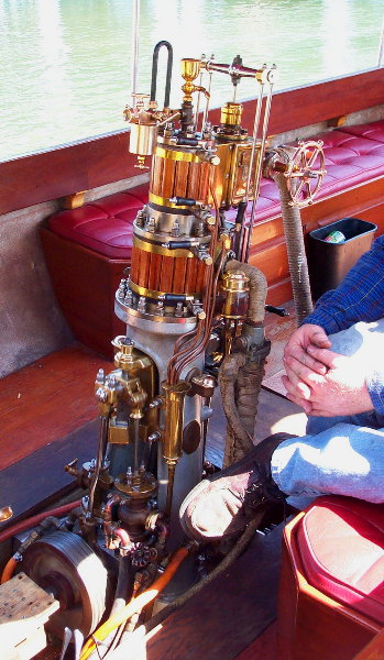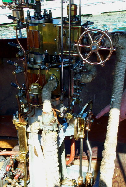 The engine, like the majority of the boat, was built by Jerry. The engine is a steeple-compound type of his own design. It ran smooth all day with no complaints.