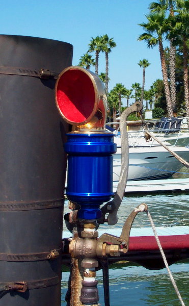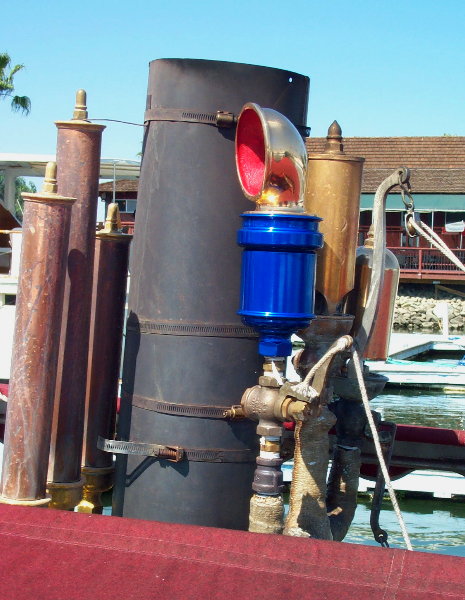 The steam siren is beautiful in anodized aluminum with a brass bell. This example (and many others on other boats in attendance) was made by Jerry in his shop. If one controls the steam valve carefully a huge range of LOUD effects can be made.