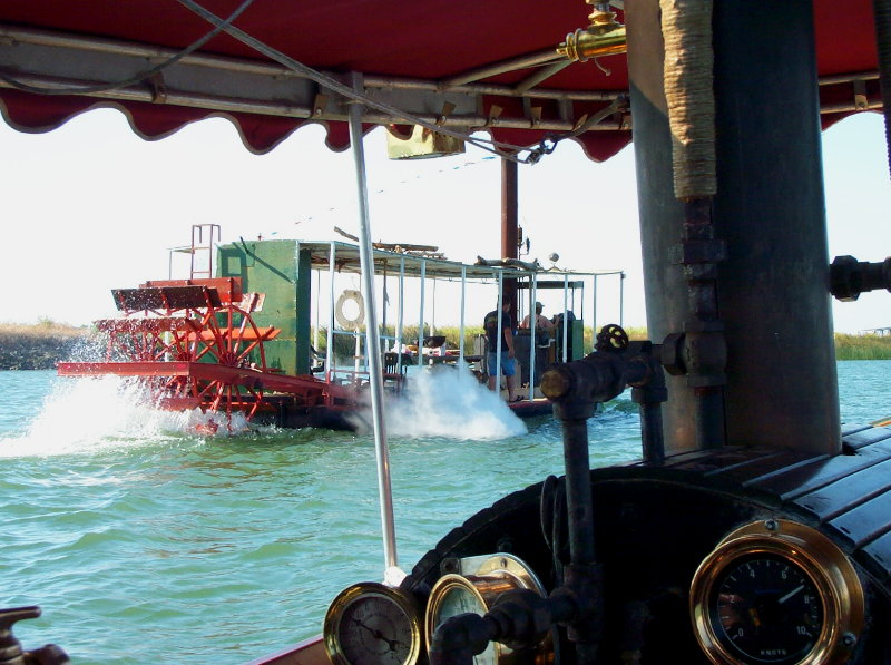 Most of the boats were headed off to a picnic in Terminus but getting a late start left us without much traffic to photograph. We did pace this interesting stern wheeler for a while. You can't really make it out in the picture but the fuel supply consisted of some very large sections of tree limbs. Either they have a large fire box or plan on some splitting while underway. In the lower right notice the knot meter on the boiler backhead: 7.25kts! (8.3mph). Top speed is said to be close to 12kts with no passengers and minimal fuel.