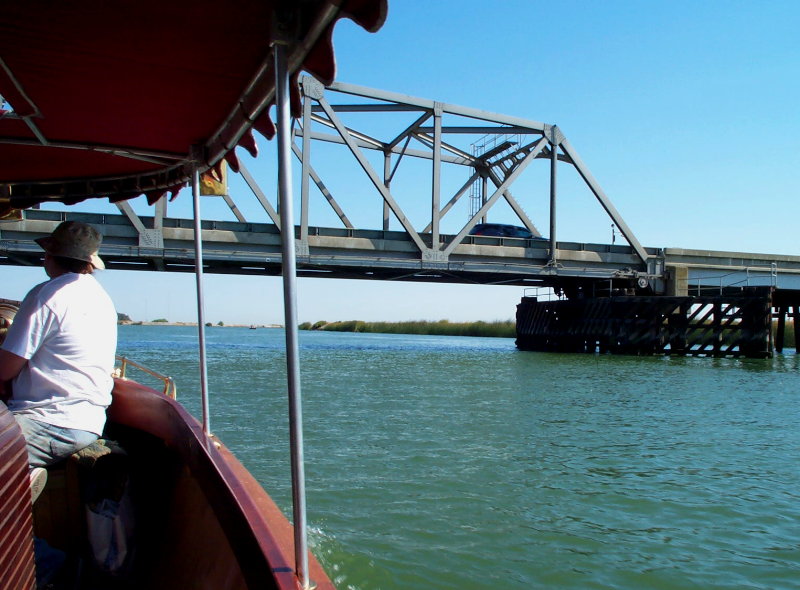 Leaving the dock we enter the main channel and take a turn around the swingbridge. Unfortunately we're not tall enough to stop traffic and get the bridge tender to demonstrate the operation of the bridge for us!